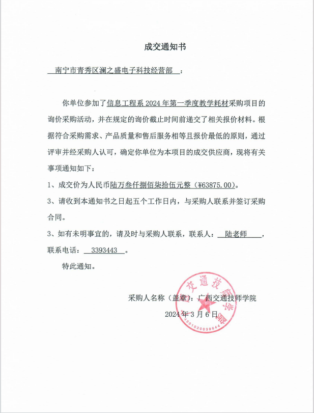 信息工程系2024年第一季度教学耗材采购项目成交结果公告