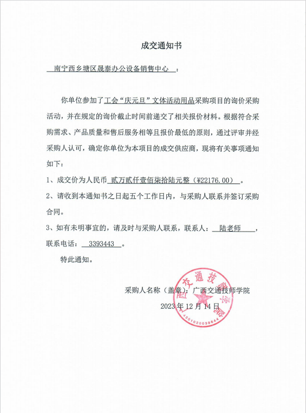 关于工会“庆元旦”文体活动用品采购成交结果公告
