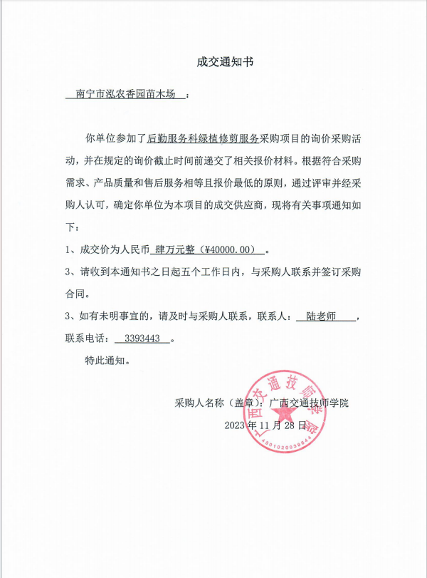 关于后勤服务科邕武校区、长堽校区绿植修剪服务采购项目成交结果公告