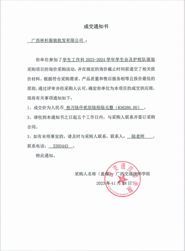 关于学生工作科2023-2024学年学生会及护校队服装采购项目成交结果公告