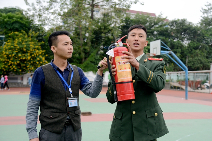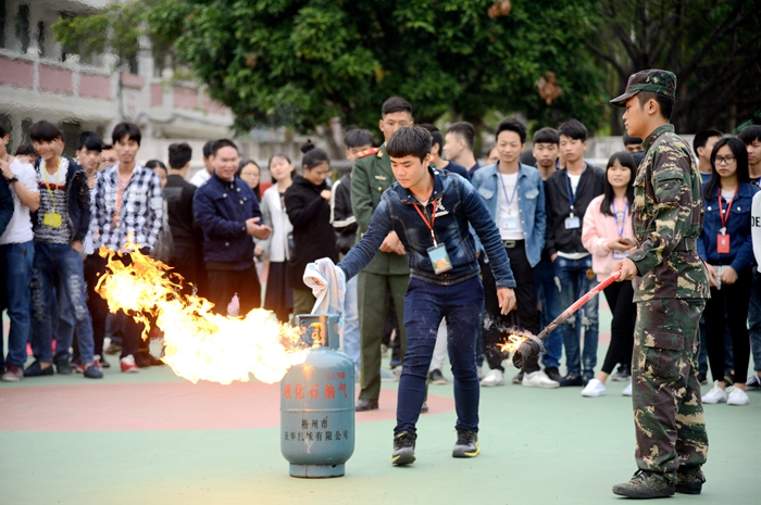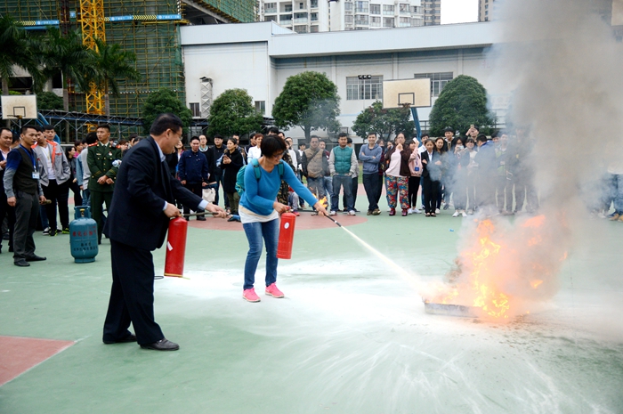 演练前,南宁市兴宁区消防大队的官兵对全校师生员工进行了消防安全理论知识培训,结合视频,详细讲解了如何报119火警、火灾的预防、火场自救及逃生方法等,并在现场演示了灭火器的操作方法和要领。随后,师生们亲自体验了现场灭火的过程,在消防官兵的指导下按照正确的方式和步骤迅速灭火。