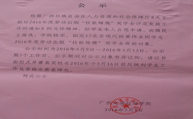 劳动出版“技能雏鹰”奖学金是人力资源和社会保障部面向全国技工院校出资设立,奖励对象为品学兼优的高级技工学校、技师学院高级工班或预备技师班的在校学生。接到人社部《关于做好2016年度劳动出版“技能雏鹰”奖学金评定发放工作的通知》后,我院在第一时间成立了“技能雏鹰”奖学金评审小组,由各班主任递交申请,学生工作处对班主任提名的候选人从学习成绩、品德、技能等各方面进行了审核讨论,经评审小组复审后决定推荐学院15北京现代班黄伟业同学参加“技能雏鹰”奖学金的评选,同时对黄伟业同学的材料进行了公示,并将申请材料上报广西壮族自治区人力资源和社会保障厅。经区人力资源和社会保障厅有关部门的审核,最后确定我院黄伟业同学享受2016年度“技能雏鹰”奖学金。
