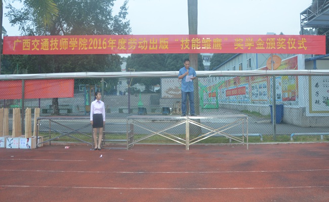 1月7日早上,2016年度劳动出版“技能雏鹰”奖学金颁奖仪式在我院足球场隆重举行。颁奖仪式由我院学生工作处副主任梁勇主持,学院樊海林助理、学生工作处领导和全体班主任及在校班级全体学生出席颁奖仪式。