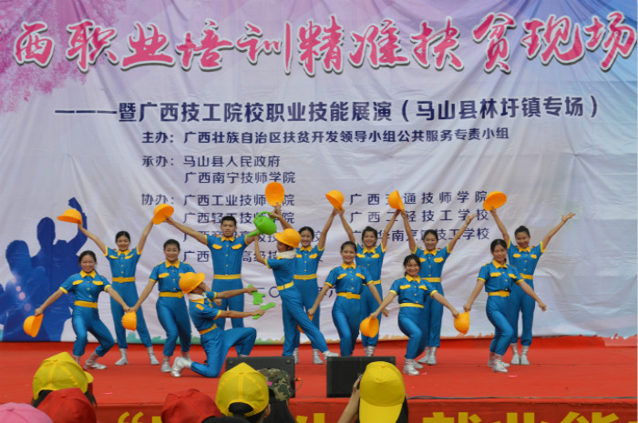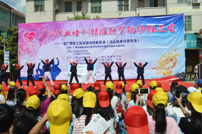 6月27日,一场别开生面的广西技工院校职业技能展演在马山县林圩镇拉开帷幕。此次展演是由广西壮族自治区扶贫开发领导小组公共服务专责小组主办,由马山县人民政府和广西南宁技师学院承办,广西工业技师学院及我院等多个院校联合协办。展演的最终目的是为推进广西职业培训精准扶贫,动员组织贫困村建档立卡贫困家庭中未继续升学的初中、高中毕业生(简称“两后生”)参加职业技能培训,实现技能就业,带动家庭脱贫。