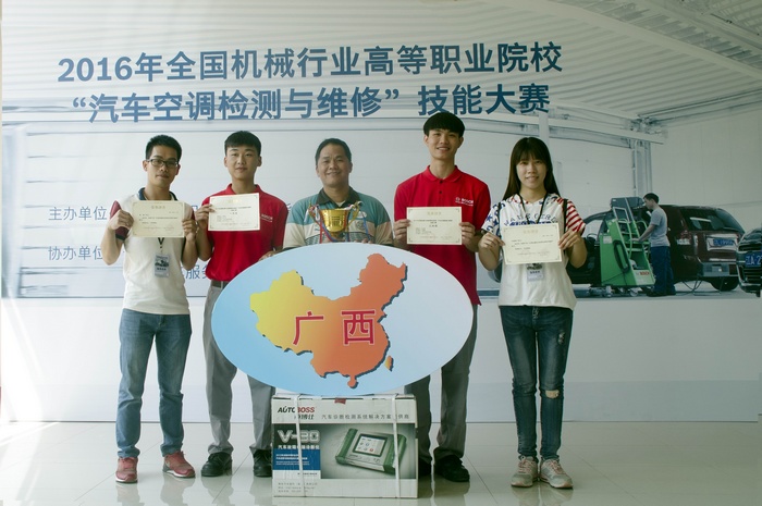 我院席艳空、孙有能两位参赛选手在比赛中沉着应战,经过3天的激烈角逐,在一个小时的规定比赛时间内在赛会指定的比赛专用的半自动空调系统实训台架上,按要求完成了汽车采暖性能检测、空调系统通风检测、制冷剂纯度检测、制冷剂泄漏检查、空调系统制冷性能检验以及相关故障检查及排除等任务,凭借过硬的专业能力、扎实的基本功及超群的专业实力,取得了娇人的成绩:席艳空荣获本次比赛的一等奖(指导老师:黄海),孙有能荣获二等奖(指导老师:韦婧婧),黄海、韦婧婧两位老师荣获“全国机械职业院校优秀指导教师称号”,我院并获奖一台V-30车博仕汽车故障电脑诊断仪。