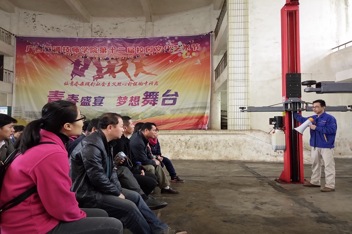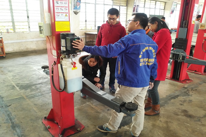 坚持“安全第一、预防为主”是我院教学过程中必须贯彻的方针。近日,学院高峰校区针对举升机在实习教学中使用频率高,安全责任大的特点,大力拓宽安全知识宣传教育渠道,邀请了专业汽保设备供应商,南宁旭海商贸有限公司技术人员到校区讲解有关举升机的安全操作要领和保养注意事项。校区汽车系各相关教师及设备管理员等人参加了此次培训。