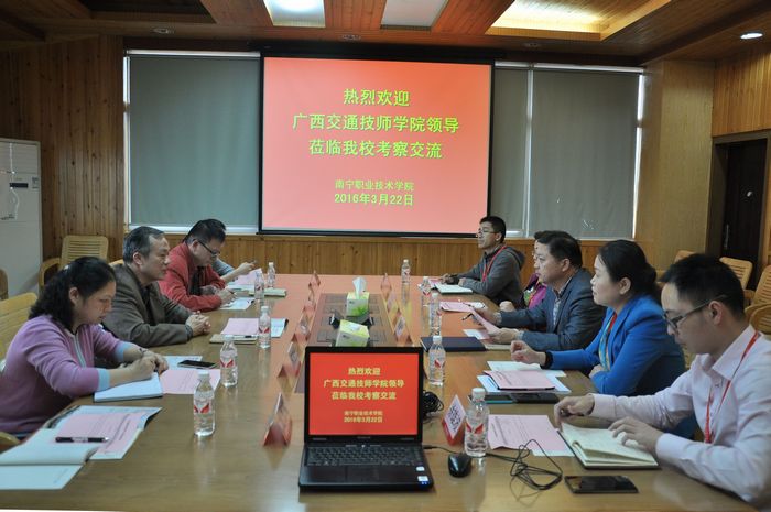 2016年3月22日-23日,我院党委副书记张健生率组织人事处主任李毅、副主任莫卫宁,招生就业处主任杨波,学生工作处副主任梁勇,团委书记李姜春等一行人先后赴南宁职业技术学院、广西工业技师学院进行学习调研。