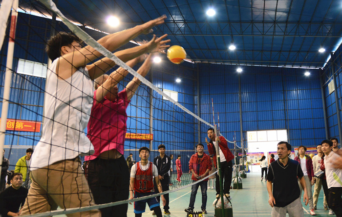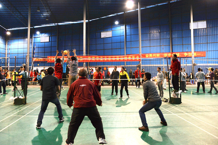 随着比赛哨声的吹响, 8个场地第一轮较量的16支队伍齐上阵。起跳、传球、扣球,一连贯默契的配合让助威加油的职工们连连叫好。