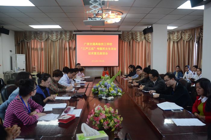 为广泛听取党员、干部、群众意见建议,2016年1月5日,“三严三实”专题民主生活会征求意见座谈会在办公楼二楼会议室召开,中层干部、专职教师、行政后勤以及学生代表共31人参加了此次座谈会。