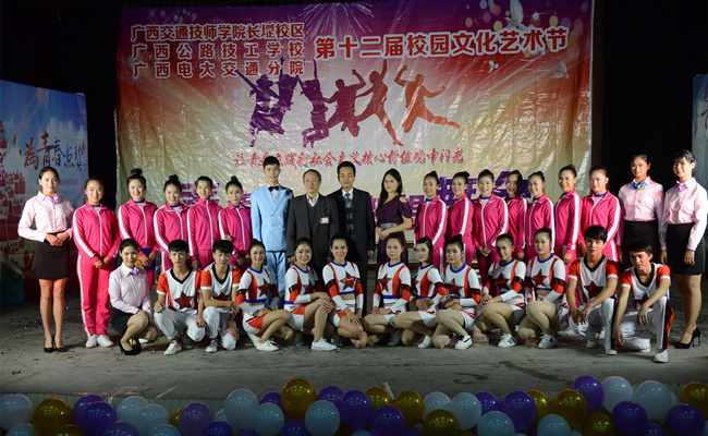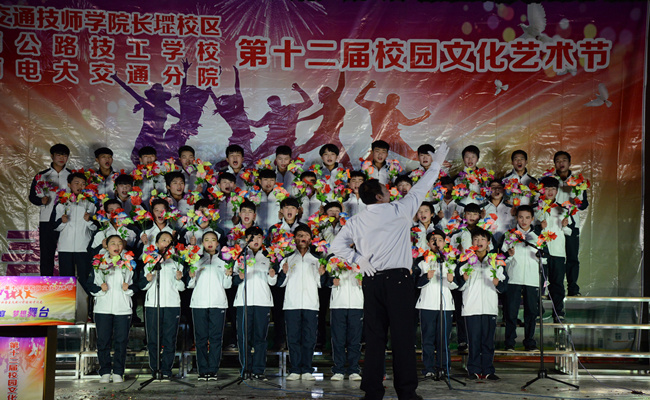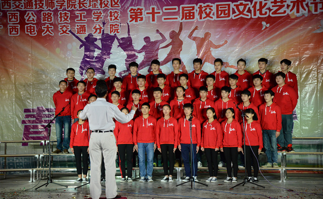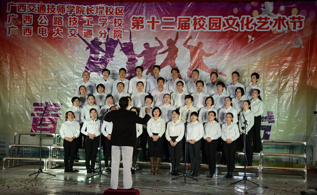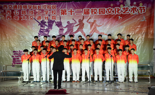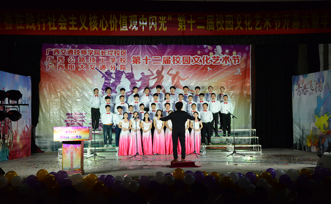 12月9日晚,广西交通技师学院长堽校区(广西公路技工学校)在该小区礼堂举行“让青春在践行社会主义核心价值观中闪光”第十二届校园文化艺术节开幕式暨学生合唱比赛。