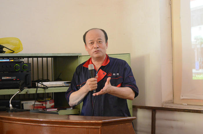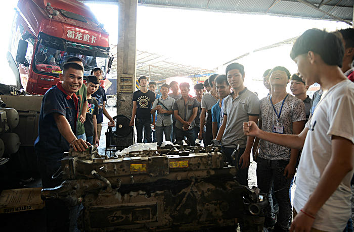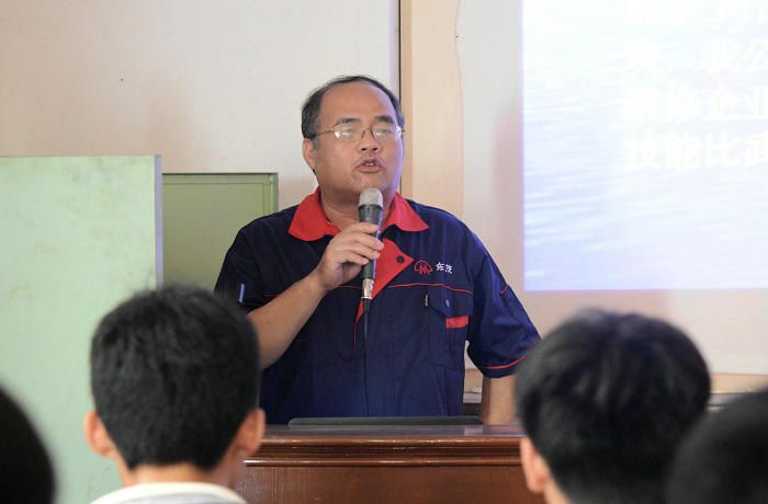 东茂公司主管生产副总王春柳,生动而细致的介绍了维修重卡的良好发展趋势。他不仅是公司主管生产经 营的领导,还是我院88届校友。他回忆了在校时期的成长,感恩学校的培养,他结合自己20多年的维修服务经历,介绍了东茂公司作为东风、柳汽、玉柴等诸多国内知名厂家的特优服务站,和这里的优秀的企业文化密不可分,和这里的员工吃苦钻研作风息息相关。他认为现在大型货车的配置升级,导致维修服务、工时费、配件需求都正处于上升期,大车维修的机器和场地在不断升级,大家可以着眼长远,不要怕苦怕累,投身到大车维修行业中来。