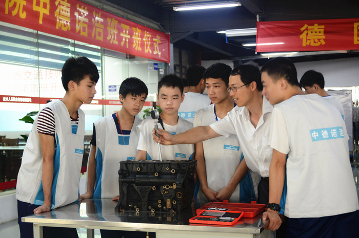 中德诺浩汽车职教课程是引进德国汽车职业教育资源,结合我国实际研制开发的一套适合我国国情的高素质、高技能汽车人才培养体系。其最大特点是,通过引进德国双元制的课程体系和办学模式,培养具有掌握汽车机电诊断与维修技术的汽车医生,以及掌握汽车新技术、具备国际服务理念的新一代高素质、高技能汽车专门人才。所有专业课程全部在与教材匹配的汽车实训室进行,学生在课堂上即可直接学习到企业工作一线的实际案例,并按照企业工作流程进行实操训练,使其在校期间即能学到企业所需技能。