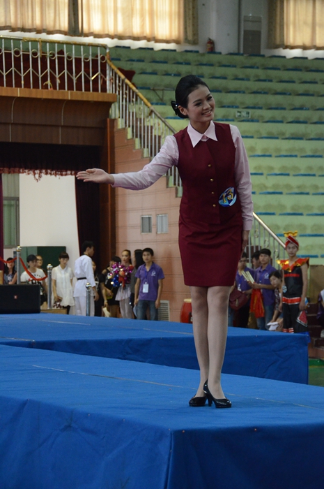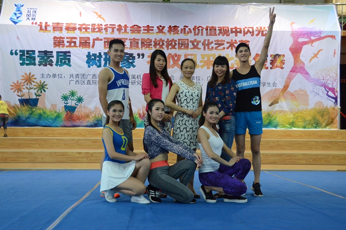 5月9日下午,第五届区直院校校园文化艺术节“强素质 树形象”礼仪风采比赛中职组总决赛在广西机电职业技术学院体育馆进行。经过初赛的角逐,共有10个学校的代表队进入决赛,每支代表队的人数为5人,每队由三女两男组成。决赛由礼仪装展示与团队介绍和团队个性服装展示两部分组成。在信息与商务系的刘飞英老师、周丽丽老师和陈蕾旭三位老师的带领下,13汽车维修与钣金中级工1班覃冰、14西式烹饪班黎东明、13高速公路服务班罗菲云、赵思琪、李岚五位同学组成了我院代表队参加决赛。