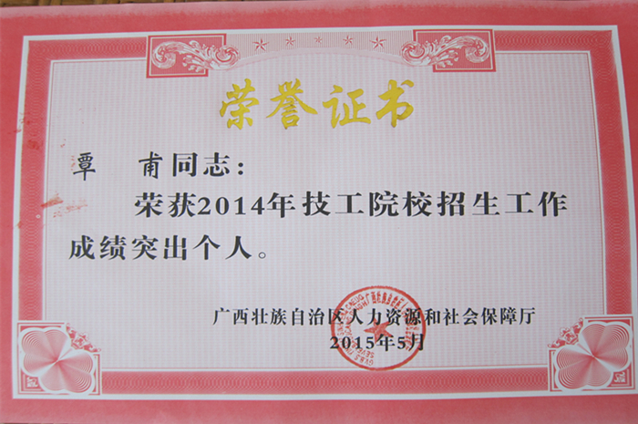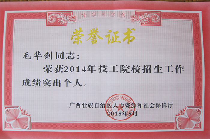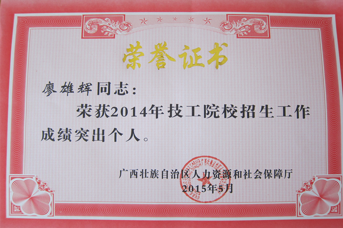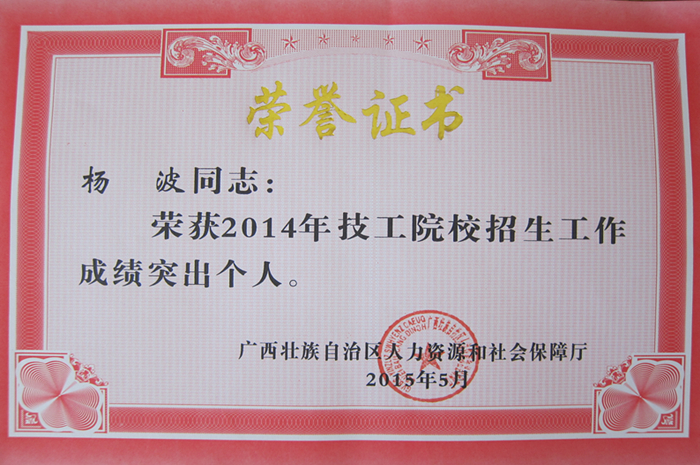 5月5日,广西壮族自治区人力资源和社会保障厅对2014年度招生工作成绩突出的15个单位以及57名教师进行了表彰,我院被评为“招生工作先进单位”,杨波、毛华剑、廖雄辉、覃甫等4名老师获得“招生工作成绩突出个人”荣誉称号。