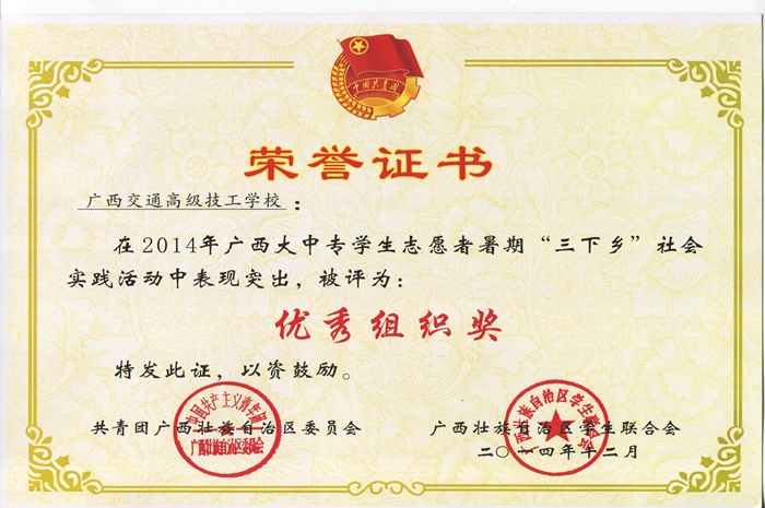 2014年自治区党委宣传部、自治区文明办、自治区教育厅、共青团广西区委、广西学联组织开展全区2014年大中专学生志愿者暑期“三下乡”社会实践活动评比表彰活动,评比出一批优秀组织奖、优秀指导教师、先进个人、优秀支持单位。
