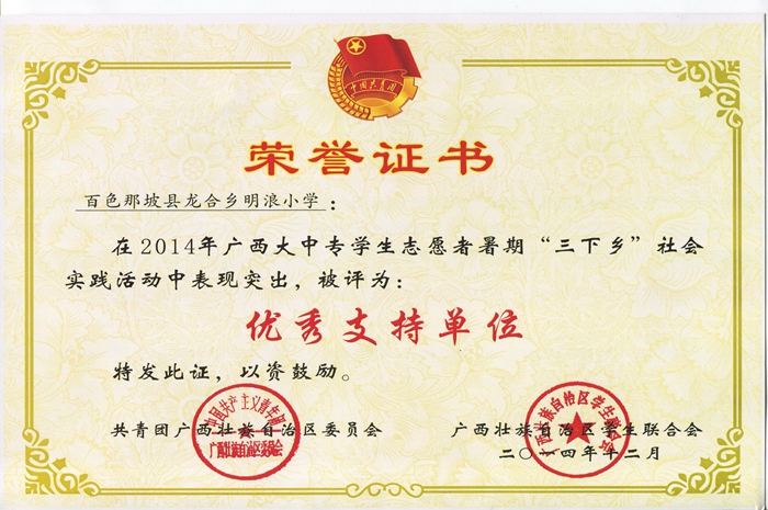 在此次评选活动中,我院荣获2014年广西大中专学生志愿者暑期“三下乡”社会实践活动“优秀组织奖”,我院帮扶学校百色那坡县龙合乡明浪小学被评委“优秀支持单位”。