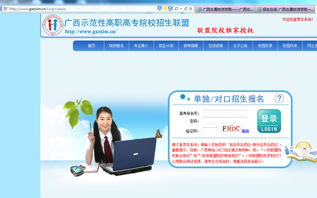 参加2015年高考报名的考生数据已导入全区招生系统,请考生抓紧填报单独/对口招生志愿。具体请登录http://www.gxzslm.cn/Index.aspx 进行填报。