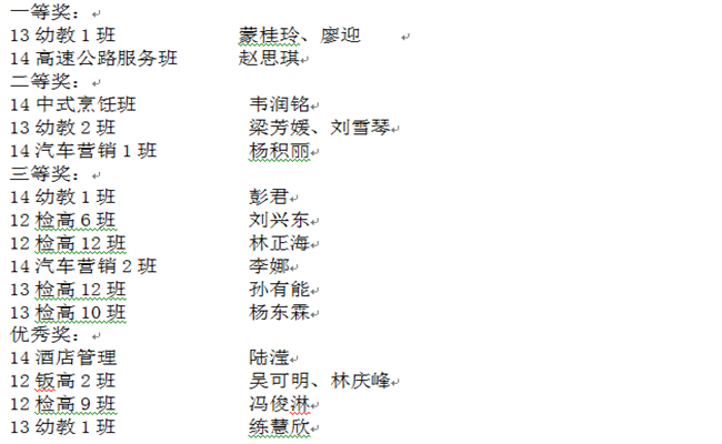 经过15位选手的精彩角逐,最终13幼教1班的蒙桂玲、廖迎和13高速公路服务班的赵思琪凭借96.1和95.4的成绩获得了比赛的一等奖。