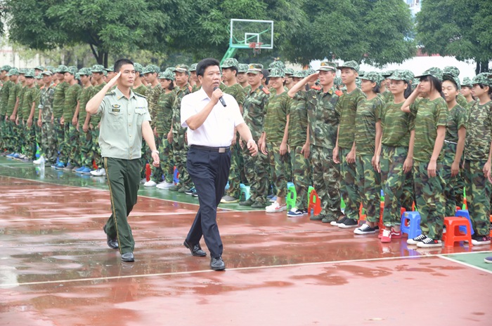 9月14日上午,我院2014级学生军训会操暨总结大会在学院本部操场及高峰校区操场举行。学院院长钟修仁、广西武警一支队队长覃振周、学院副院长关菲明、院长助理谭劲涛、郑超文以及学院部分中层领导出席大会。