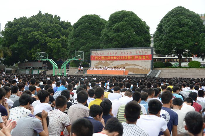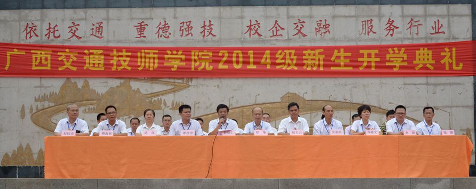 9月1日上午,广西交通技师学院2014级新生开学典礼在学院灯光球场举行。学院院长钟修仁,党委书记罗华,副院长陆天云、关菲明,院长助理谭劲涛、郑超文以及全体中层领导干部出席开学典礼。典礼由钟修仁院长主持。2400多名新生参加典礼。