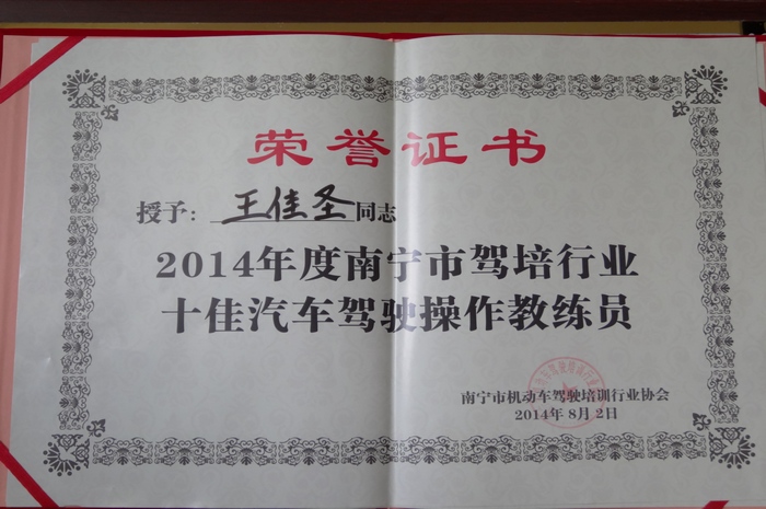 我校教练员王佳圣和邓崇功喜获“南宁市2014年度十佳汽车驾驶操作教练员”称号