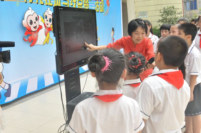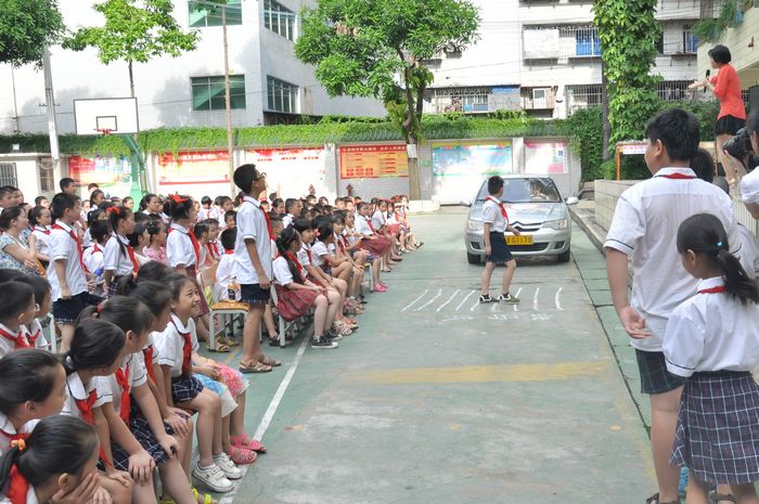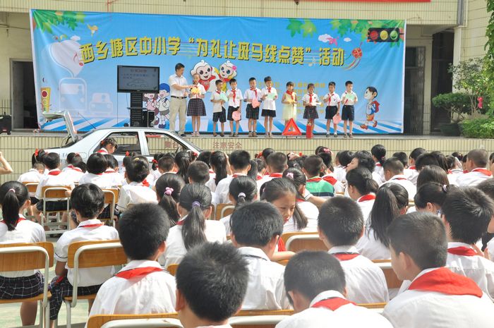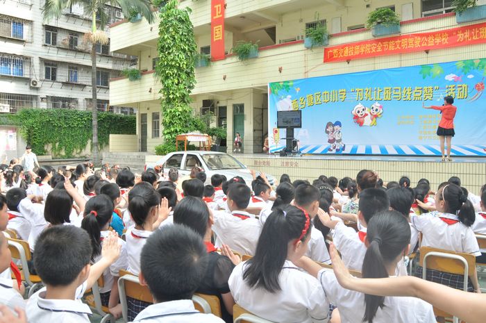 7月4日早上,由西乡塘区教育局主办,《南国早报》、广西交通技师学院、华强街道团工委、南宁市卫国小学共同承办的“为礼让斑马线点赞”交通安全学习活动在卫国小学举行。卫国小学700多名师生以及部分家长参加了活动。