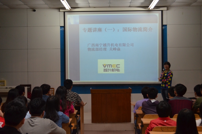 为了系统掌握现代国际物流知识,提高我院物流专业师生物流专业水平,5月7日晚,学院信息与商务系邀请广西南宁越升机电有限公司物流部经理关峥焱在我院阶梯教室举办了一场国际物流专题讲座,我院物流教研室老师以及物流专业的学生共80多人参加。