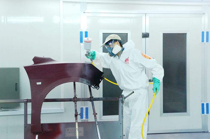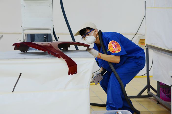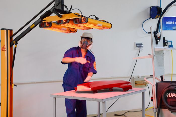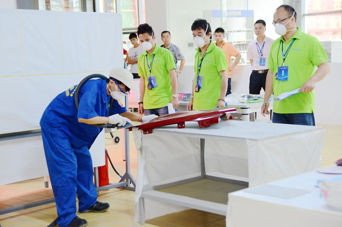 我院选手林剑波进行汽车涂装竞赛子项目——面漆喷涂